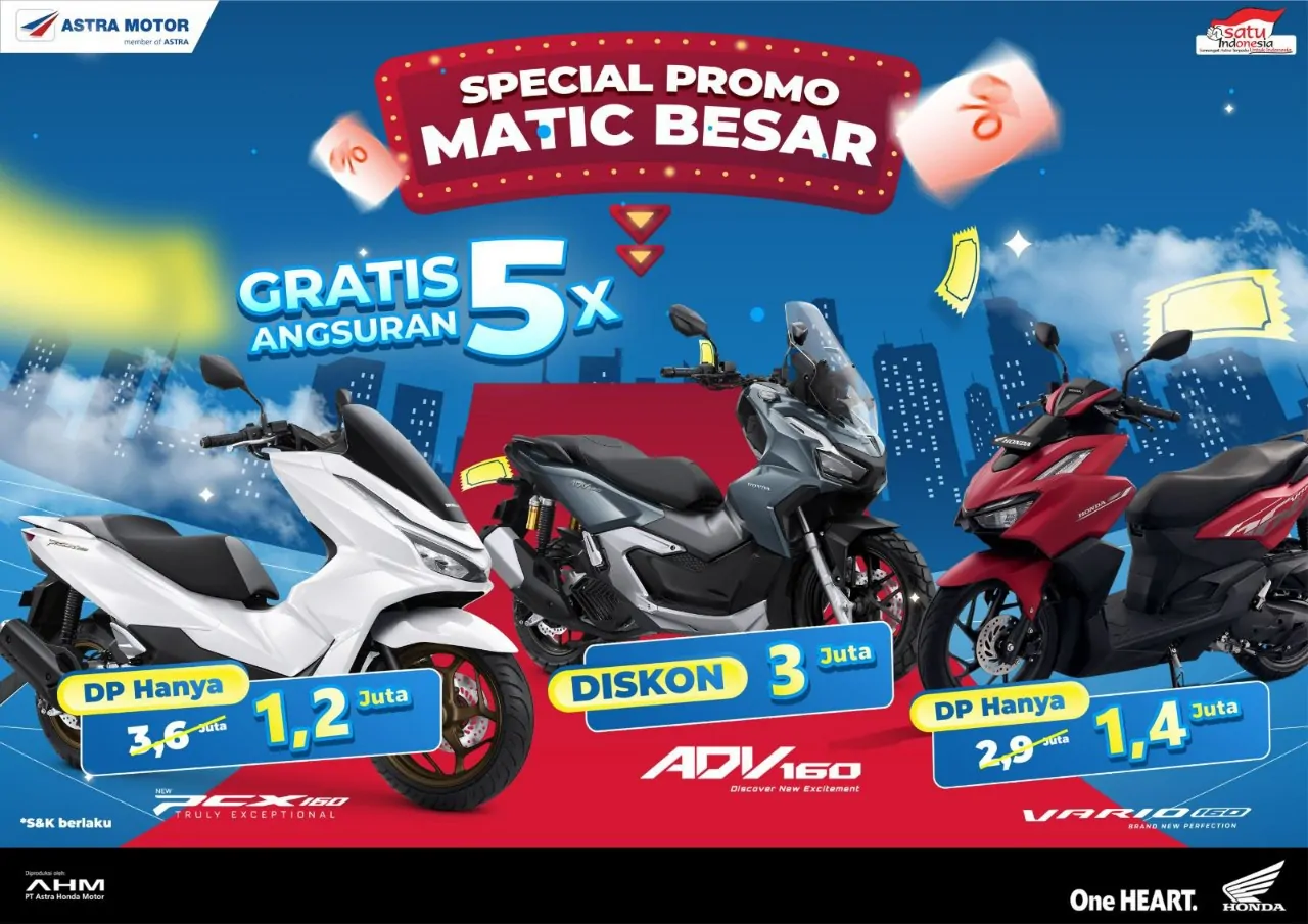 Program ini meliputi Honda PCX 160 dengan DP hanya Rp 1,2 juta, Honda ADV 160 dengan potongan hingga Rp 3 juta, serta Honda Vario 160 dengan DP hanya Rp 1,4 juta. Masing-masing model juga menawarkan gratis angsuran hingga 5 kali.