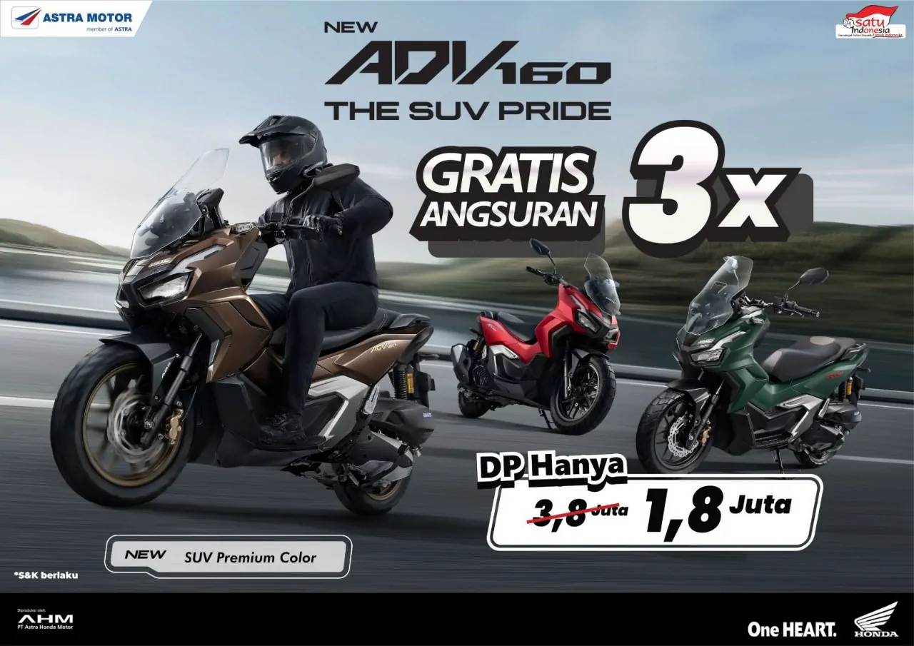 Selain itu, Promo Spesial New Honda ADV160 “The SUV Pride” juga kembali dihadirkan bagi konsumen yang menginginkan sensasi berkendara gagah dan bertenaga. Melalui promo ini, konsumen dapat memiliki ADV160 dengan DP hanya Rp 1,8 juta dan gratis angsuran 3 kali.