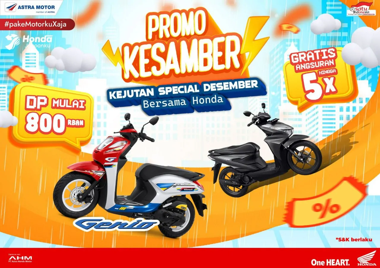 Konsumen cukup membayar DP Rp 1,1 juta, mendapatkan gratis angsuran 3 kali, serta memperoleh jaket keren eksklusif Honda sebagai bonus khusus selama periode Desember.