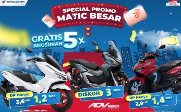 Program ini meliputi Honda PCX 160 dengan DP hanya Rp 1,2 juta, Honda ADV 160 dengan potongan hingga Rp 3 juta, serta Honda Vario 160 dengan DP hanya Rp 1,4 juta. Masing-masing model juga menawarkan gratis angsuran hingga 5 kali.